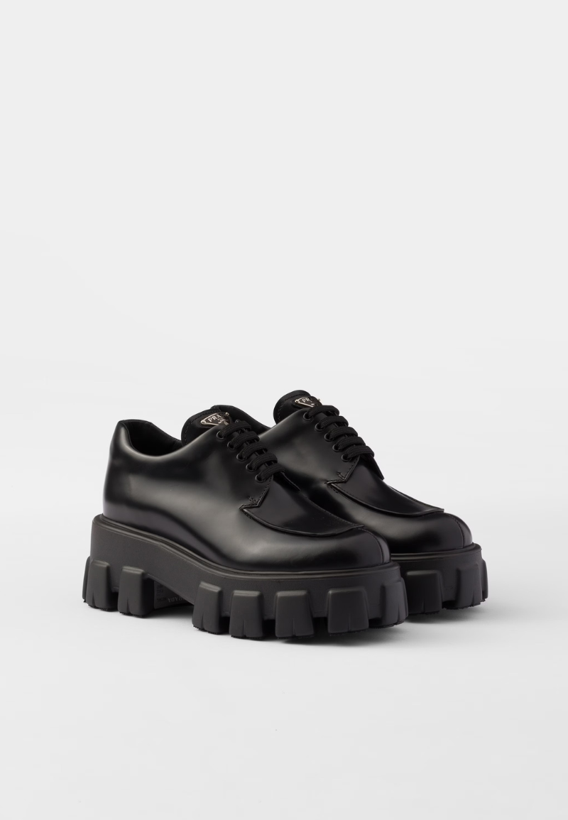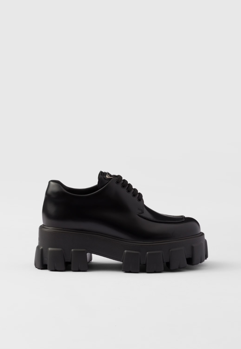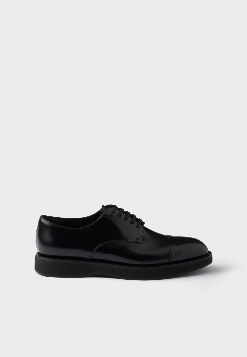 A clean, sleek aesthetic characterizes the contemporary style of these brushed leather lace-up shoes with a voluminous silhouette. The important construction and metal lettering logo underline the personality of the shoe.